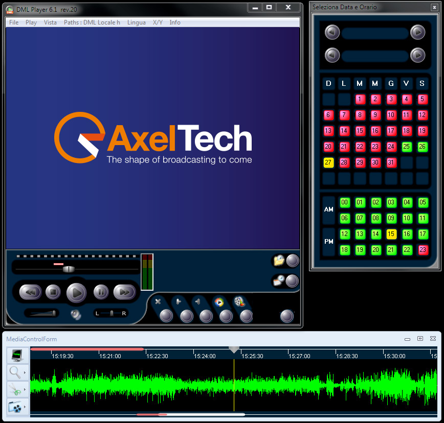 DML Player is a free software application for real time content browsing from any networked Pc. Exclusive simultaneous multi-channel playback allows accurate audio temporal comparison. The calendar window shows the available recordings. Just ‘click’ on desired date and time to start playout. Play speed is variable from 0.5x to 16x. Go To date / time function allows direct playback to specific recorded events. Capability to jump to specific date and time using generic automation Log files.