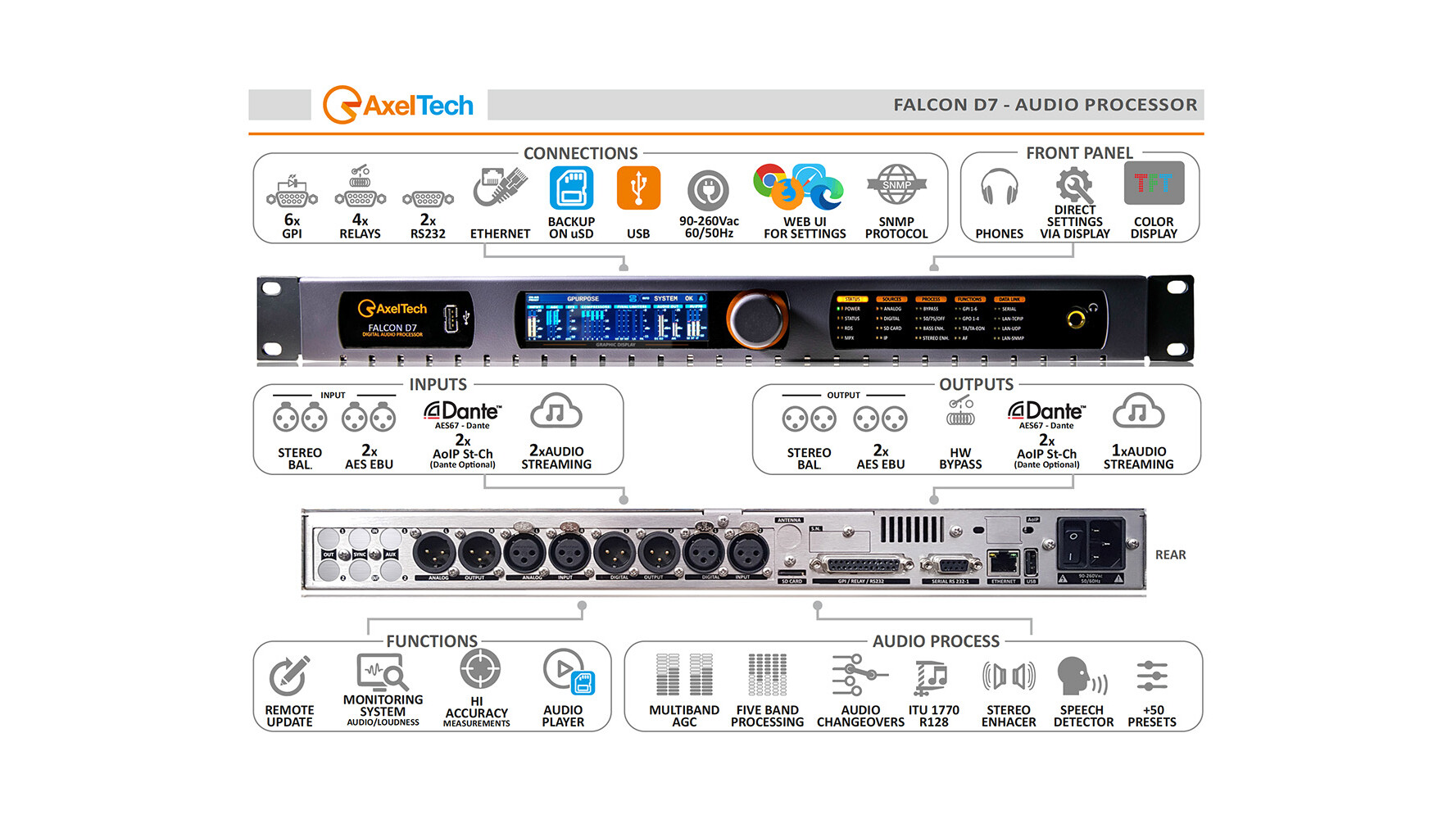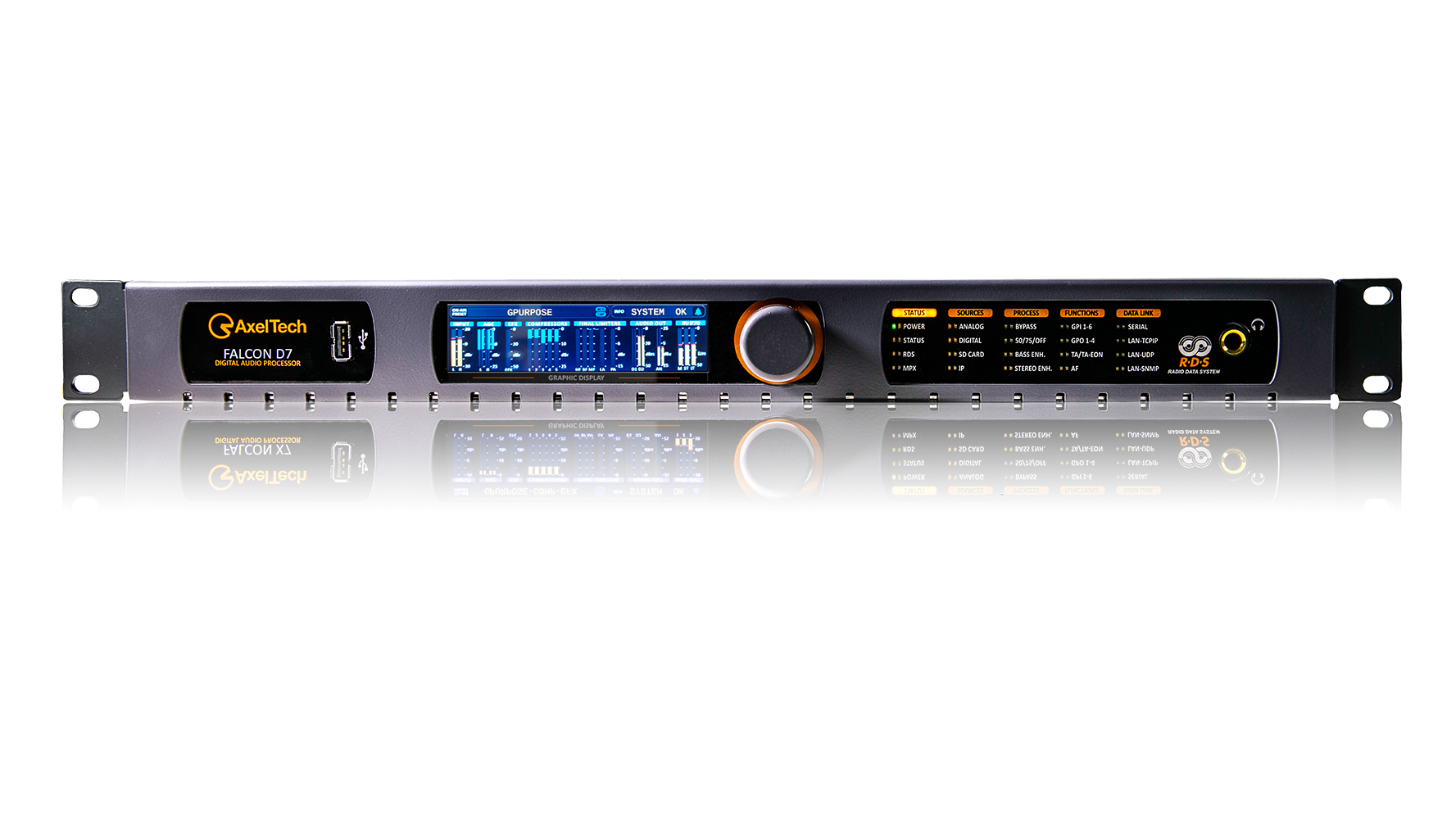 Falcon D7 is an all-in-one equipment (Audio Processor, Loudness Control, Change Over) for TV, DAB, HD Radio, Sirius XM, Web applications thanks to the 20 kHz Processing architecture. Falcon D7 offers ease of use and high quality performances and generates a perfect sound. Falcon D7 the top of its category thanks to many features and functions often not available on much higher priced devices. Falcon D7 sounds great and enables you to set up your perfect sound identity by choosing the pre set that suits better with the style of your channel or by tailor making your own set.
