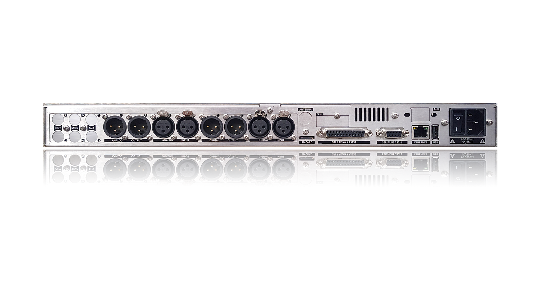 - Full range of outputs: : one analog, two digital audio (over XLR connectors), two Optional Dante™ and one IP streams.