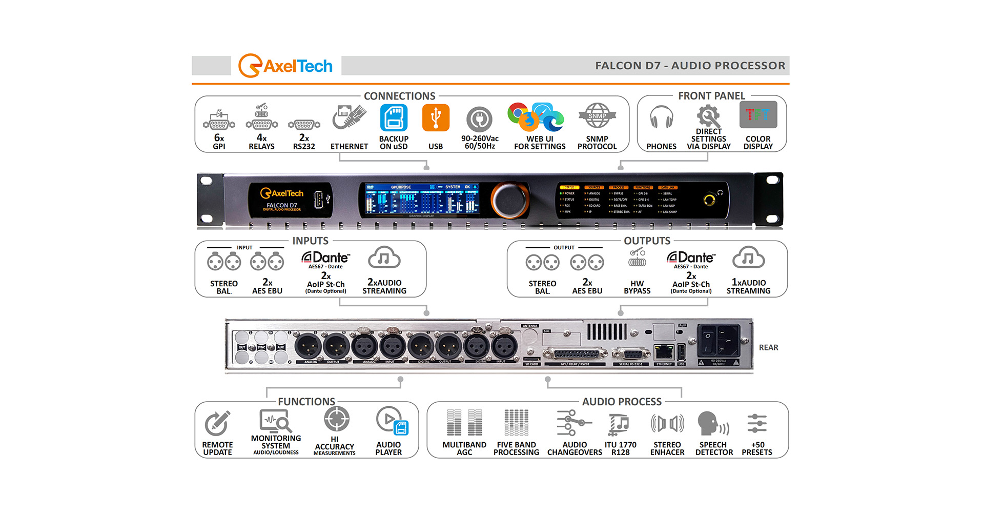 Falcon D7 is an all-in-one equipment (Audio Processor, Loudness Control, Change Over) for TV, DAB, HD Radio, Sirius XM, Web applications thanks to the 20 kHz Processing architecture. Falcon D7 offers ease of use and high quality performances and generates a perfect sound. Falcon D7 the top of its category thanks to many features and functions often not available on much higher priced devices. Falcon D7 sounds great and enables you to set up your perfect sound identity by choosing the pre set that suits better with the style of your channel or by tailor making your own set.