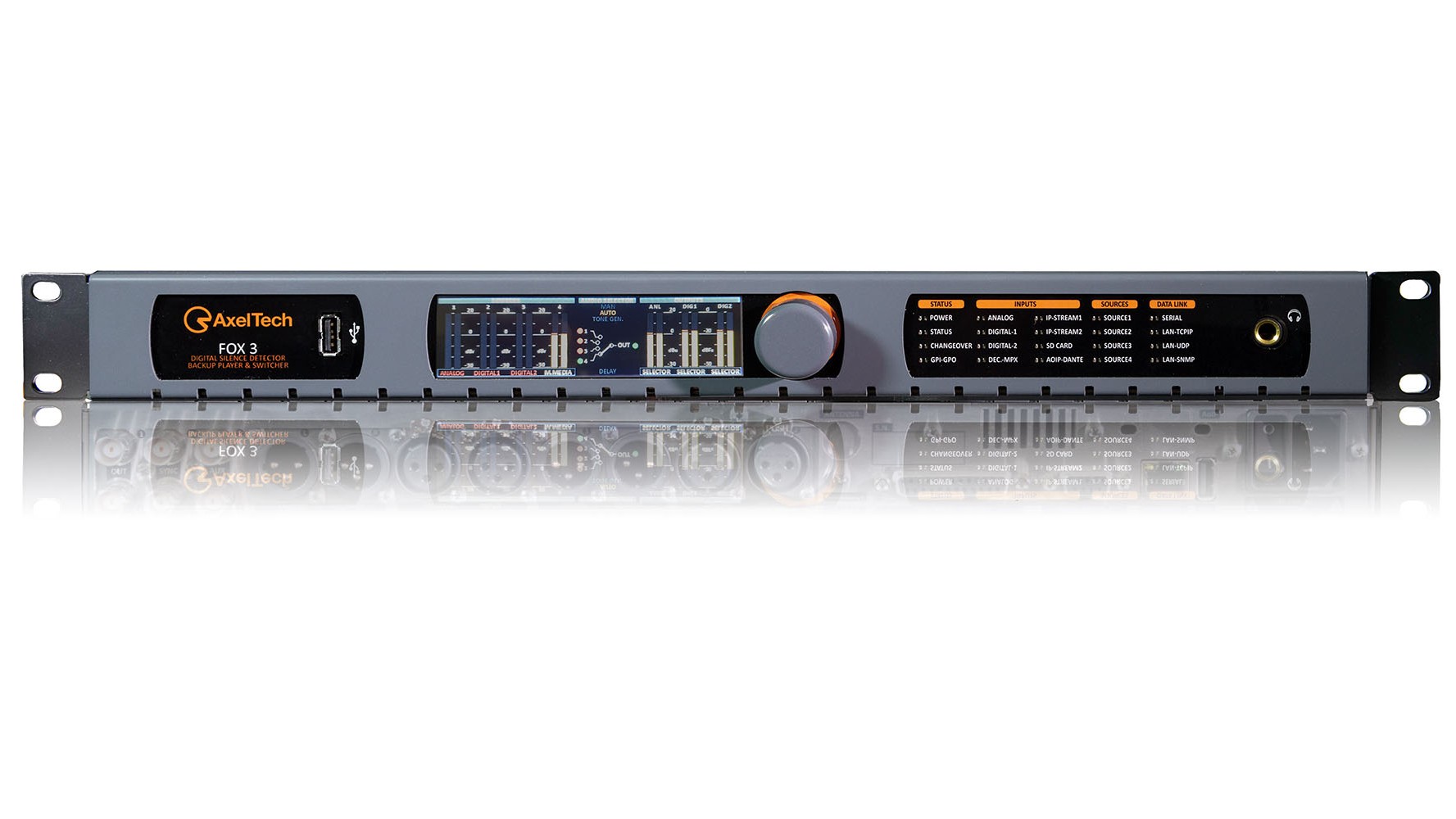 - FOX 3 is a fully configurable Audio Changeover/Silence Detector to switch over four out of the Analog, Digital, MPX, IP, AoIP, DanteTM (optional) and Built In Player inputs.