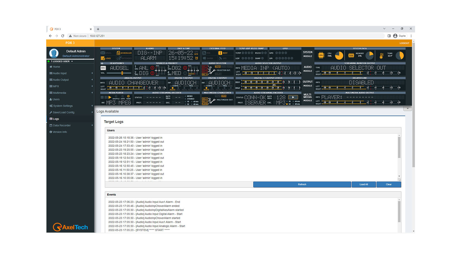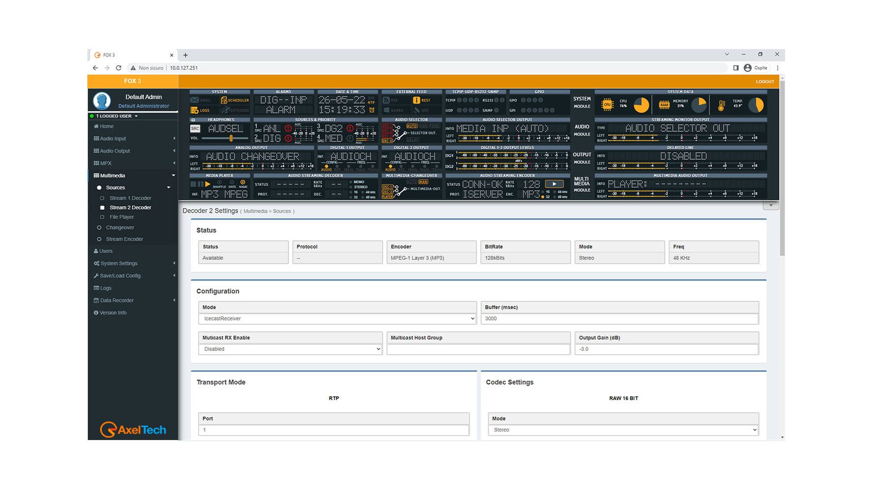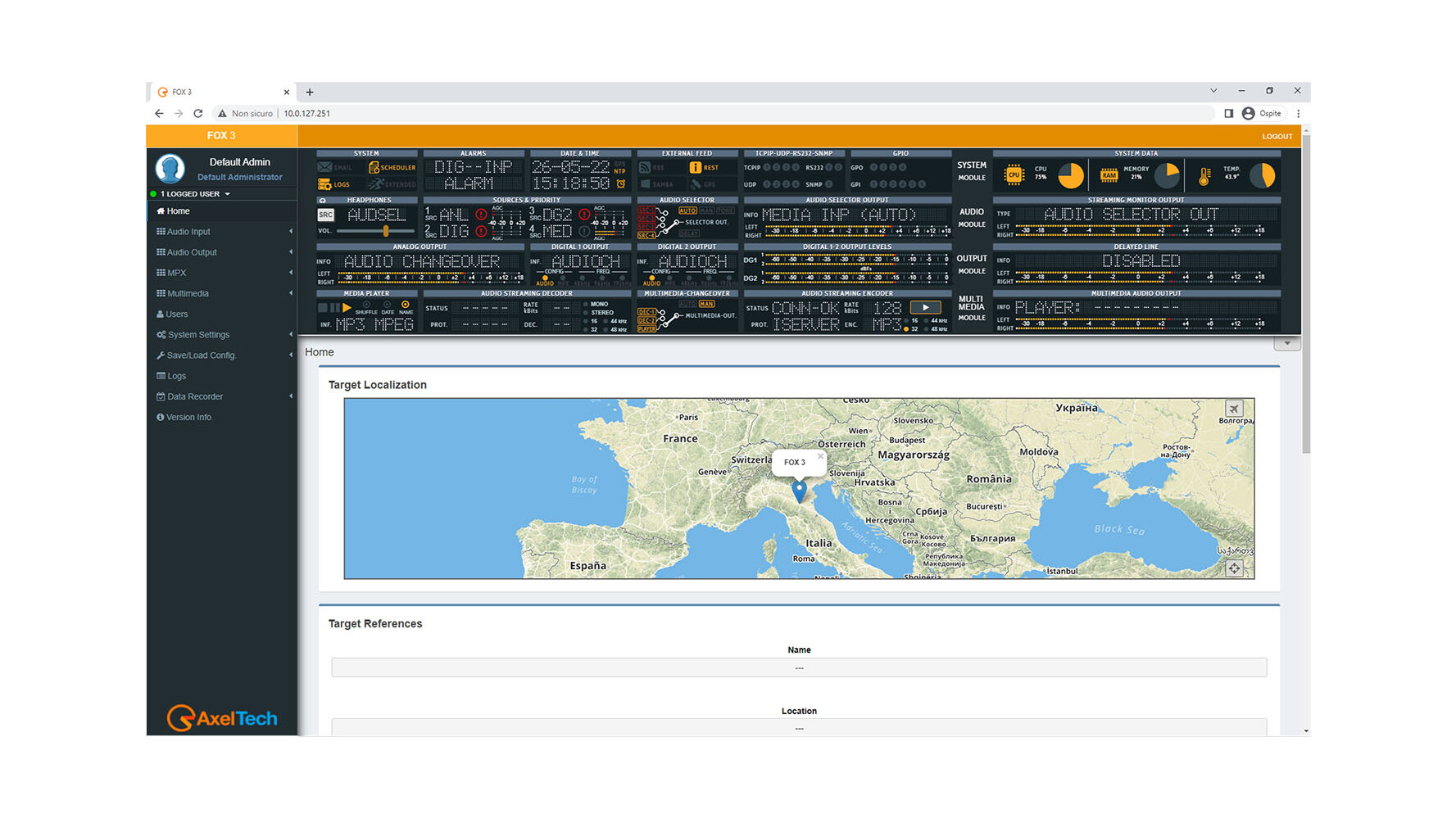 Moreover, connecting an external GPS allows to geo-localize the FOX 3. The WEB server supplies a page with a map that shows the appliance position. Standard Ethernet interface can manage up to 4 independent TCP ports, up to 4 separate UDP ports and 1 SNMP port. Obviously, it also shows the input and output of all signal levels.