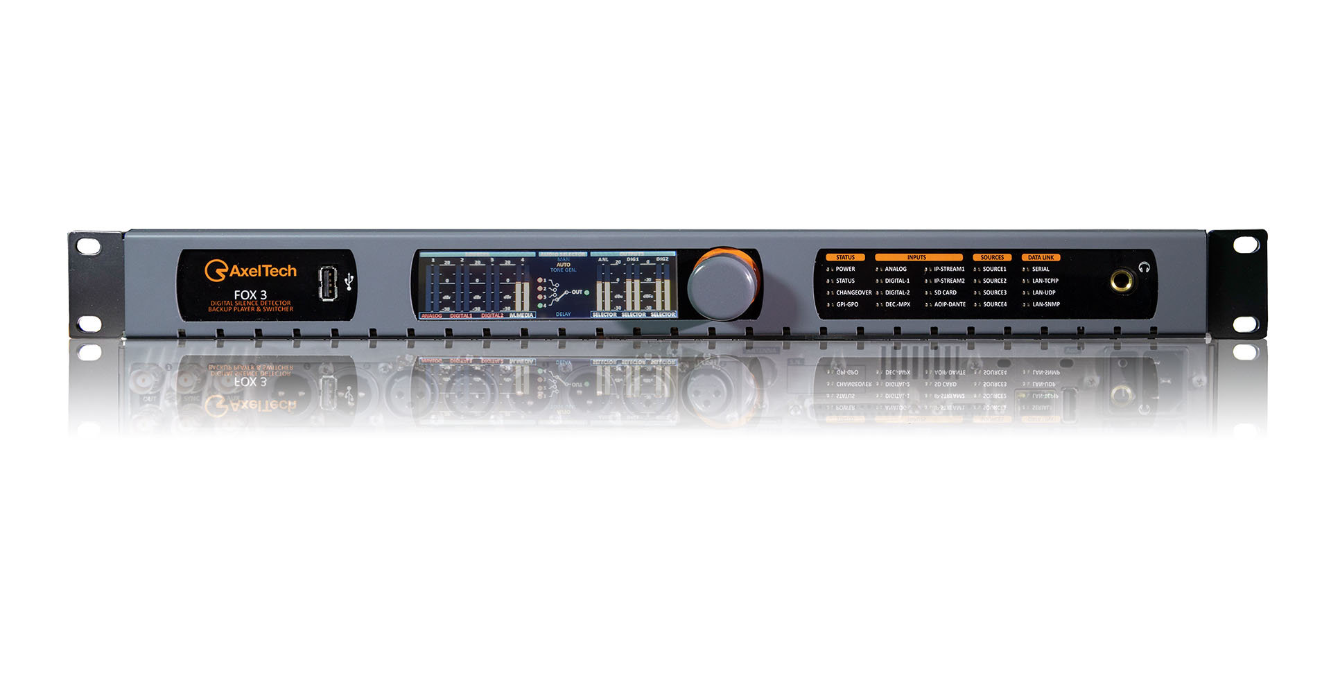 - FOX 3 is a fully configurable Audio Changeover/Silence Detector to switch over four out of the Analog, Digital, MPX, IP, AoIP, DanteTM (optional) and Built In Player inputs.