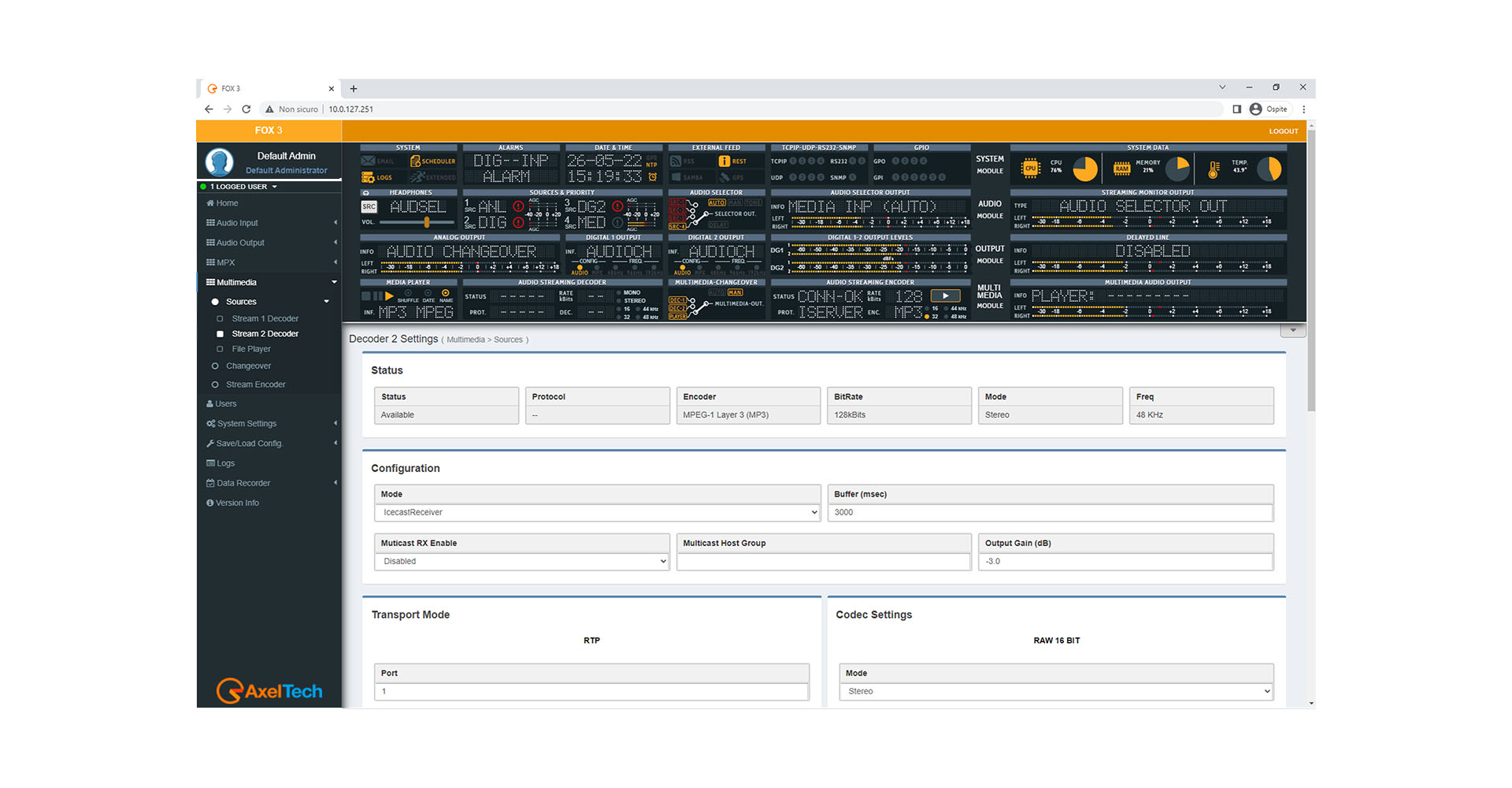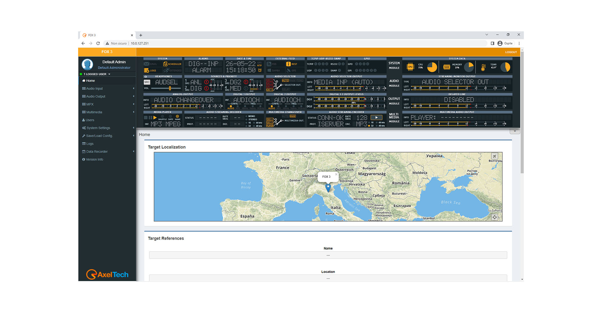 Moreover, connecting an external GPS allows to geo-localize the FOX 3. The WEB server supplies a page with a map that shows the appliance position. Standard Ethernet interface can manage up to 4 independent TCP ports, up to 4 separate UDP ports and 1 SNMP port. Obviously, it also shows the input and output of all signal levels.