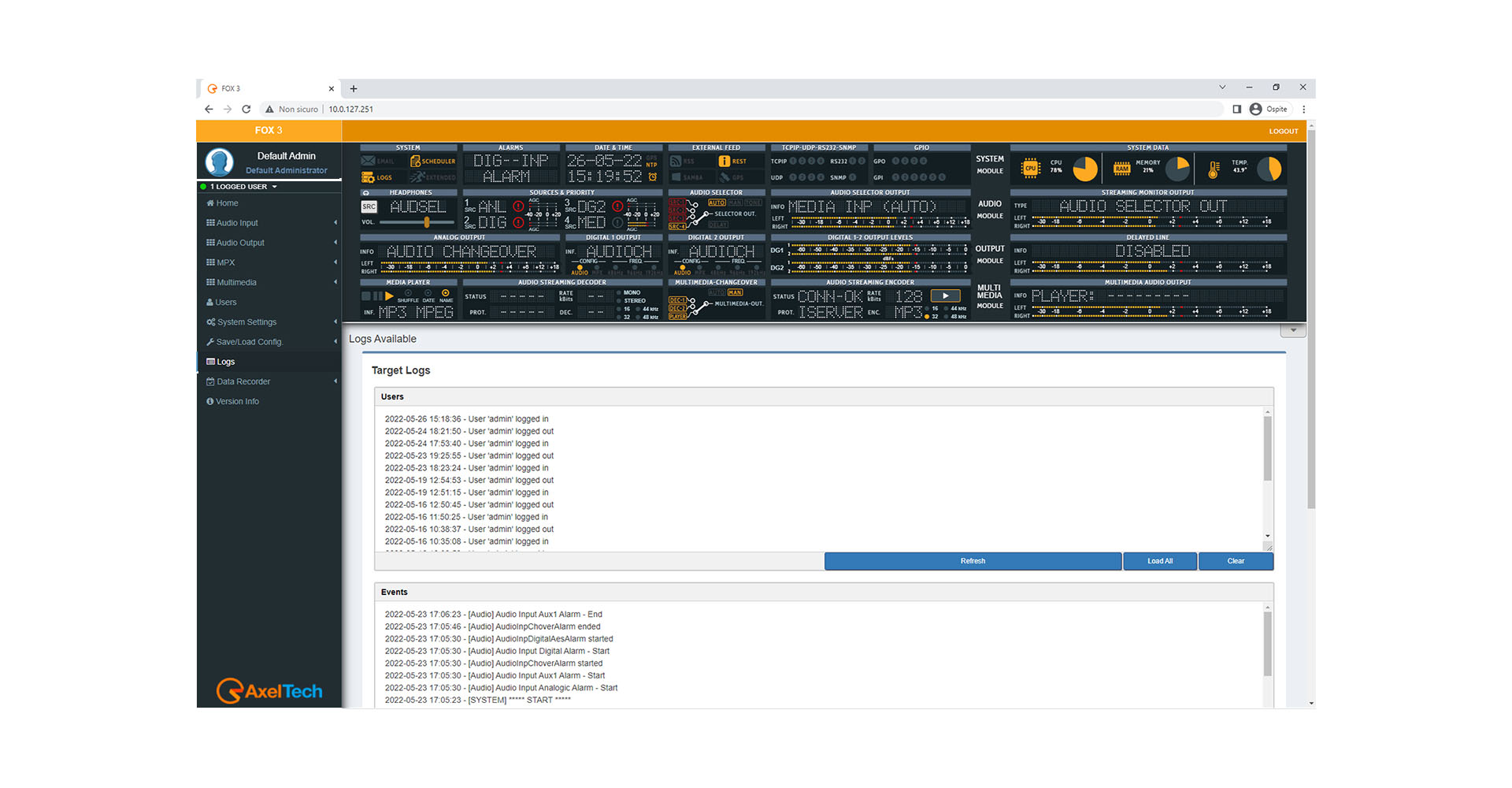Users can manage FOX 3 equipment via LAN, no need to install any client software. The internal Web Server can be managed with any browsers (Chrome, Firefox, Explorer, Opera…). The GUI on the web page is clear, easy to use and responsive, suitable to be managed from any device: Personal Computers, tablets, smartphones.