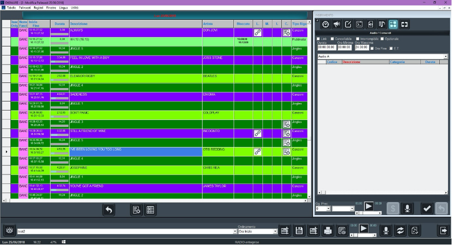 Priority = the order in which Digiware inserts the song categories when creating a schedule. The lower the number, the higher the priority. Example: I have a category called NEW with priority 1 and inside there is a piece by Bruce Springsteen. The category NEW will be inserted first in the schedule and then the old Bruce Springsteen songs that are in the other categories will be transmitted less because it will already find in the schedule the author Bruce SpringsteenFrequency = if the song can go every day, once a week, once a month etc. If you have a sufficient number of songs and you have done well the clocks, I recommend leaving the daily frequency, because the songs will rotate well anyway. NOTE: THE FREQUENCY PARAMETER ONLY REGARDS THE SONGS AND NOT THE AUTHORS.% = percentage of draft. If you set for example 50%, 50% of the songs of that category passed by less time will be discarded even before choosing which song to insert. To be used with caution: if you have a sufficient number of songs it is not necessary and if you abuse of it, you can have many unscheduled (red lines)Execute controls= it must always be enabled, otherwise it chooses songs randomly and without criteriaSong/Artist parameters They are the same both for the single song and for the author, but it is clear that they must be thought in the perspective of the single song or the author when they are set.SONG Repetitions = How many times the same song can be scheduled inside the frequency. Example: if dailyfrequency = how many times a day can go.AUTHOR Repetitions = how many times A DAY can be scheduled the same author.SONG Today’s delay = in case of daily frequency and repetitions greater than 1 is the minimum distance to keep between one passage of the song and the next (NB: if this parameter is useless because we have set repetitions = 1 put the value 00:01)AUTHOR Today’s delay = in case of repetitions greater than 1 is the minimum distance to keep between a passage of the artist and the next (NB: if this parameter is useless because we have set repetitions = 1 put the value 00:01)Previous passages = number of previous passages that must respect all the parameters set (NB if you use the parameter Previous Days it is advisable to set this parameter to 1)Previous Delay = Minimum distance to keep with respect to the scheduling times of the previous days (example: Set the value to 01:00 for the Song. If the song yesterday was scheduled at 10:00, today can be scheduled before 9 or after 11)Previous Days = number of previous days that must respect all the parameters set (NB set the value at least to 1)Parameters for manual replacementThese parameters are to speed up the creation of the alternative list, in the advanced replacement of a song in the schedule. Activation is recommended only in case of very slow networks/PCs or in case of databases with a high number of songs.Percentage search for songs = activates the search only within the percentage set belowSearch depth = the analysis of alternatives will take place only within the set percentage.