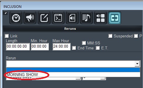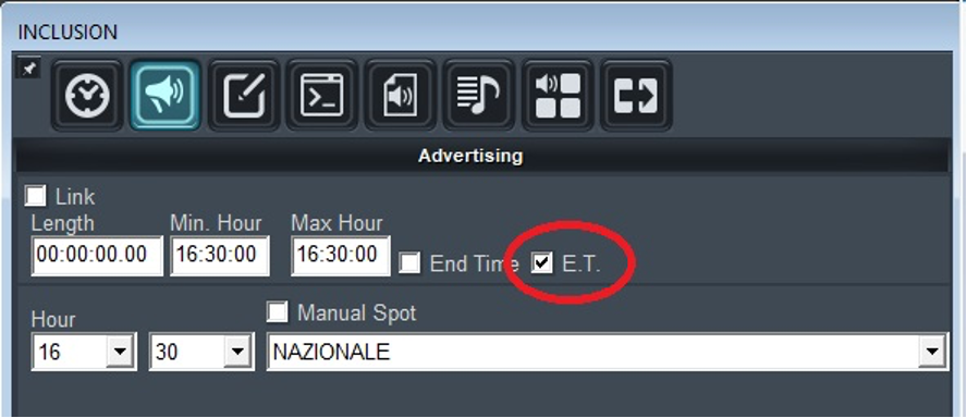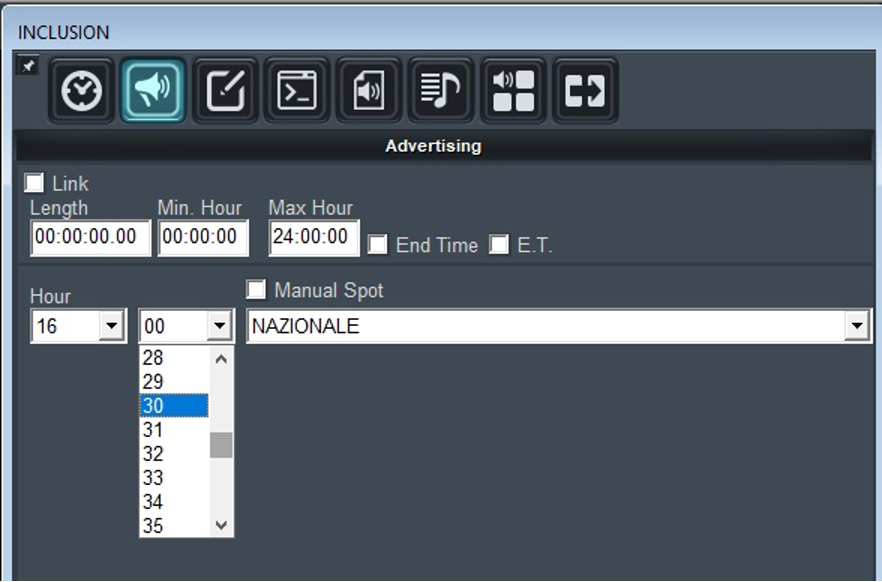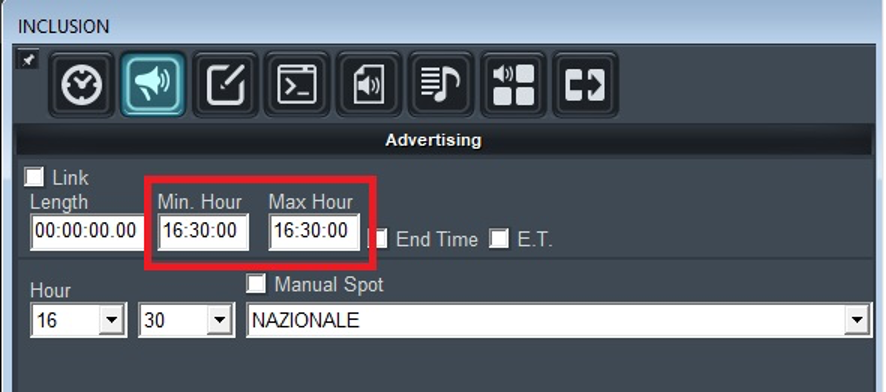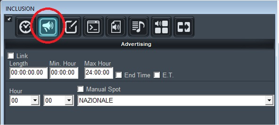 WARNING: As the program will be rerun containing EXACTLY the same items, you must pay a particular attention to advertising clusters. If you rerun the program in a different hour, you must insert the advertising cluster with HH:00 format (e.g. the cluster of midnight and 1 minute can be inserted as 00:01 or HH:01, you must choose this second way).