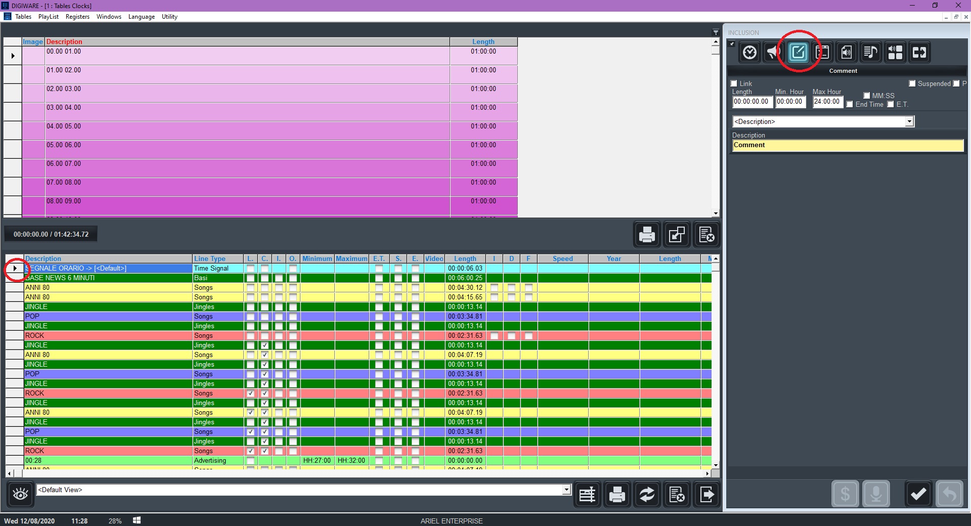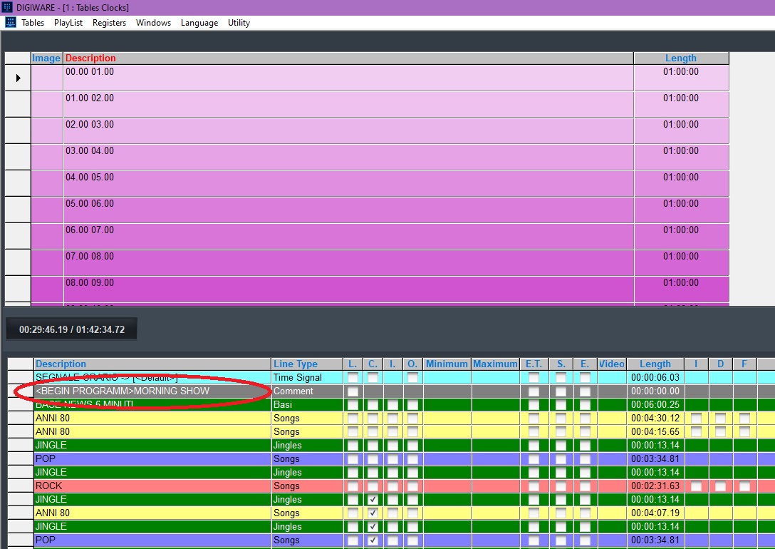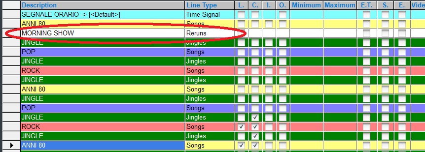 The reruns must be set on the Clocks (Bands) that compose the preschedule.First of all, you need to set markers on the program you want to be rerun, then you can schedule the rerun.MARKERS ON THE PROGRAM TO BE RERUNOpen the Clock (Band) where you schedule the program you want to rerun.Position on the beginning of the program to be rerun and click on the Comment tool