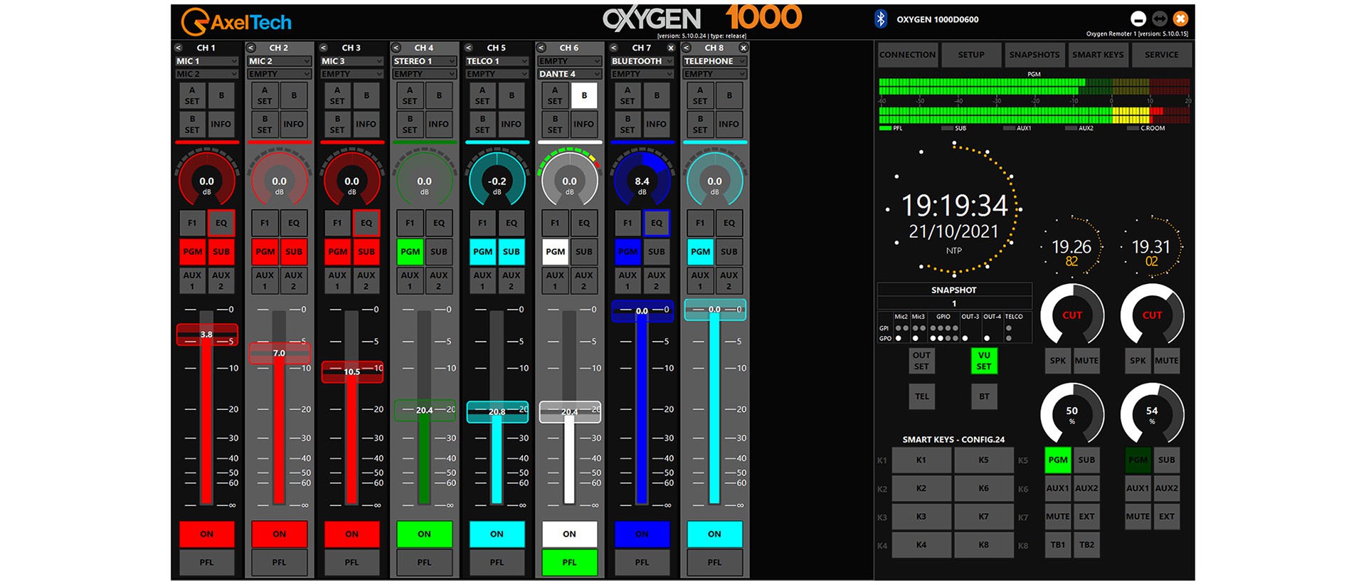 Reliable and easy to use as an analogue mixing console Oxygen 1000 offers top class features: Low Latency, Users Preset, Smart Keys, EQ, Compressors, Telephone Hybrid, HDMI Output, Analogue and Digital I/O, USB, BT, Dante™ AoIP, Telco, Presenter Talk Box.