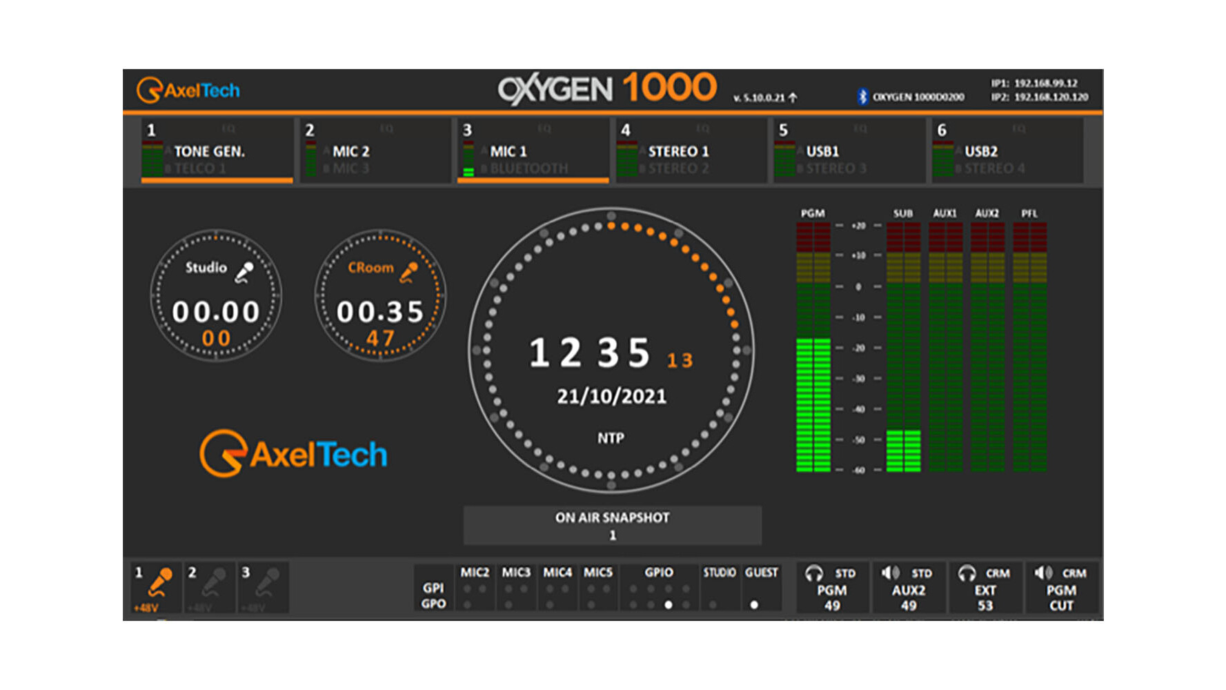 Oxygen 1000 Rack has a BT module. This allows airing the calls made via GSM, Skype, Viber and WhatsApp with a Smartphone, a Tablet or a PC. Oxygen 1000 has two BT connection modes: bidirectional to support phone calls, monodirectional to put on air high quality stereo audio (A2DP) streamed by BT sources.
