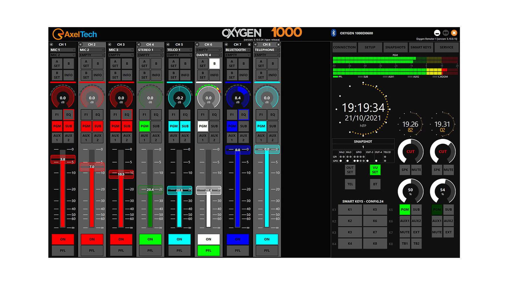 Reliable and easy to use as an analogue mixing console Oxygen 1000 Rack offers top class features: Low Latency, Users Preset, Smart Keys, EQ, Compressors, Telephone Hybrid, HDMI Output, Analogue and Digital I/O, USB, BT, Dante™ AoIP, Telco, Presenter Talk Box.