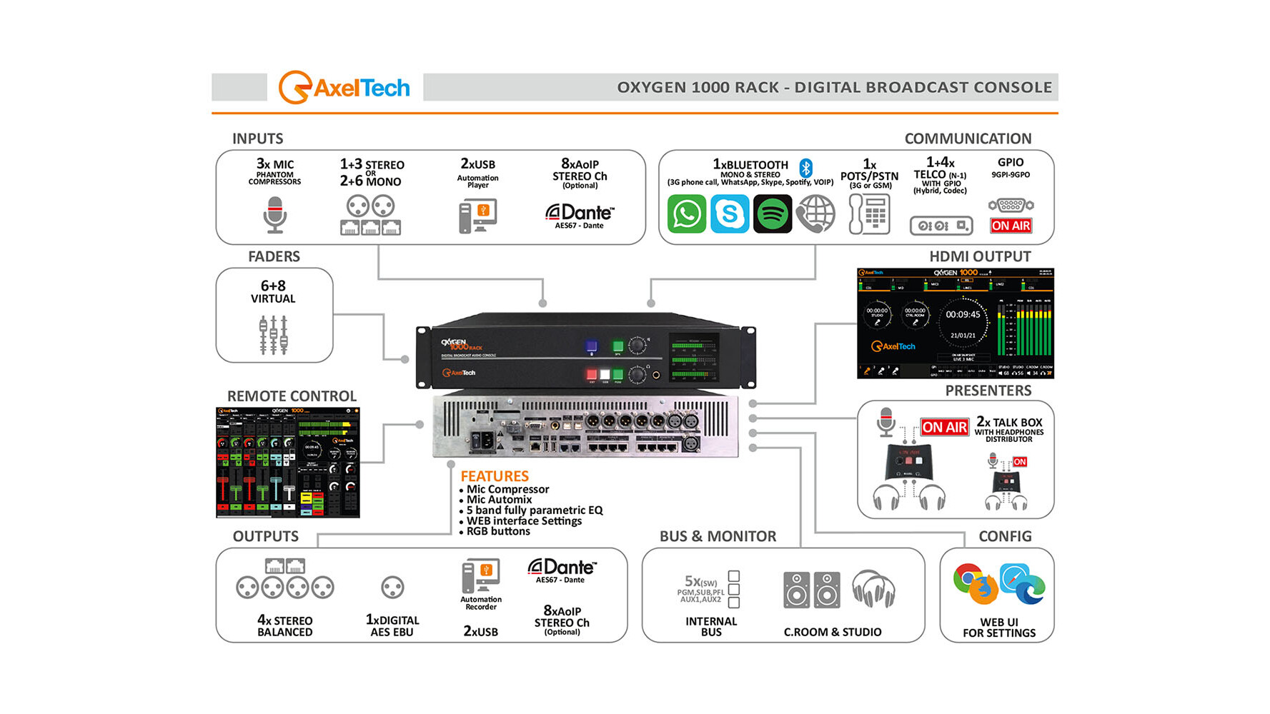 Oxygen 1000 Rack is a fader less fully Digital Broadcast Console designed for On Air and Production in any Radio Station, with 3 microphone inputs with Automix, a powerful internal audio routing and a wide range of controls and I/O in a rugged and classy steel 2 RU chassis.