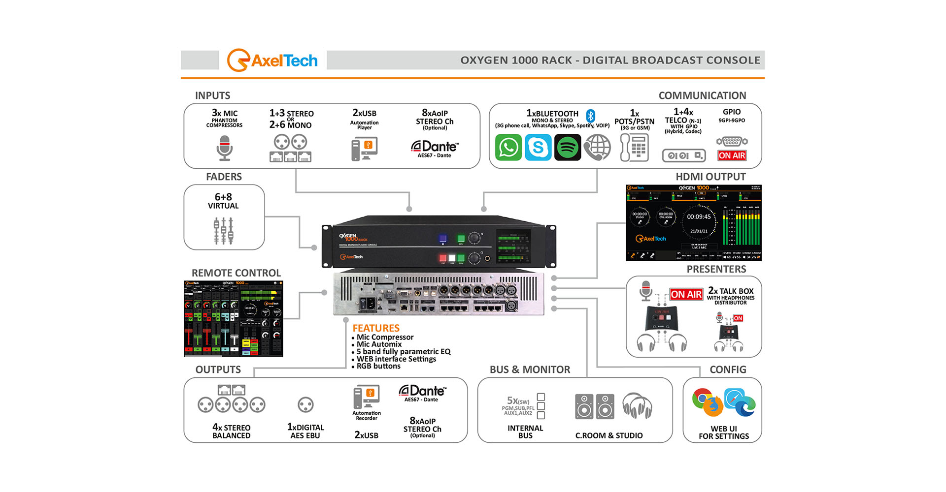 Oxygen 1000 Rack is a fader less fully Digital Broadcast Console designed for On Air and Production in any Radio Station, with 3 microphone inputs with Automix, a powerful internal audio routing and a wide range of controls and I/O in a rugged and classy steel 2 RU chassis.