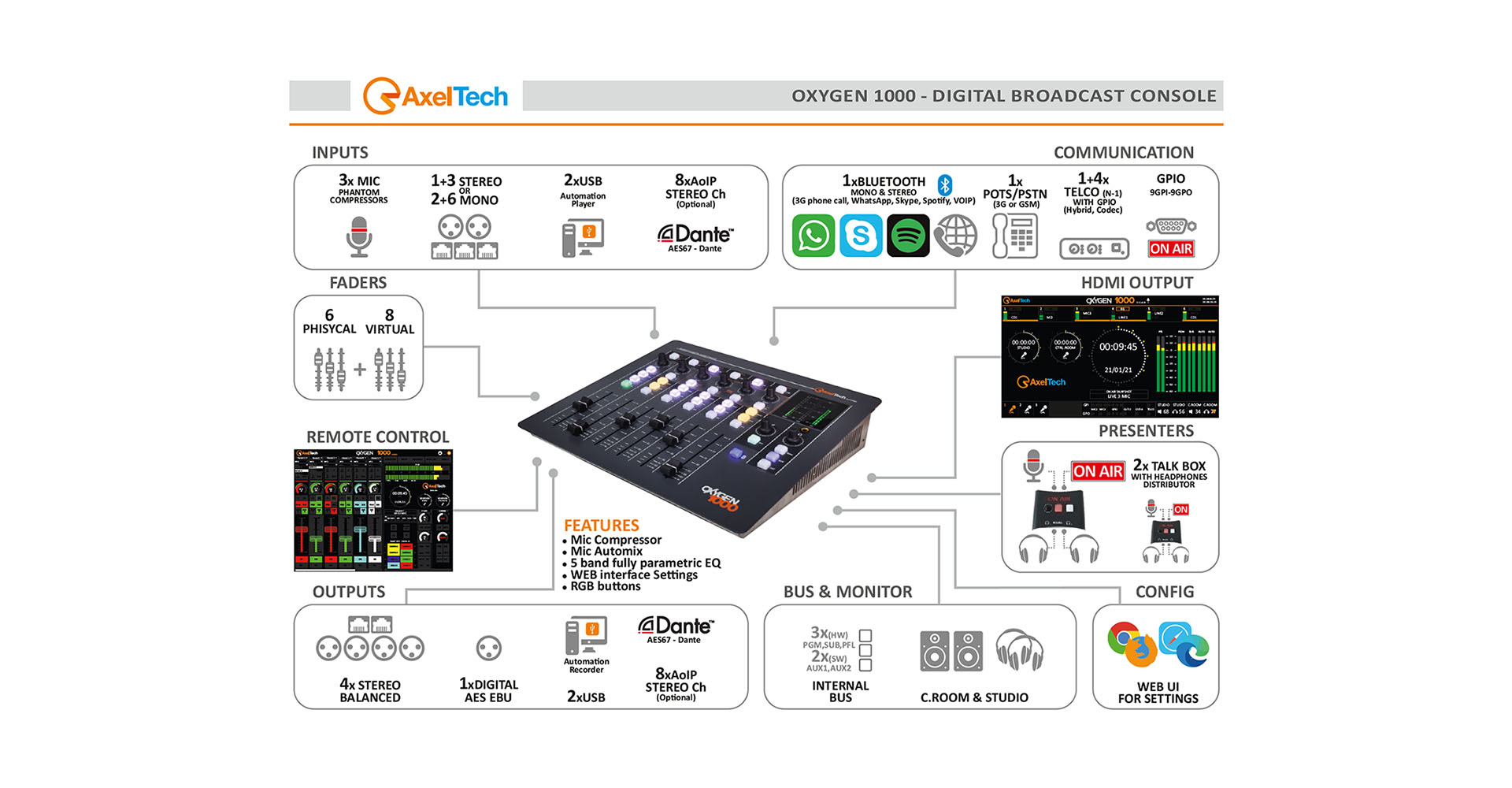 Reliable and easy to use as an analogue mixing console Oxygen 1000 offers top class features: Low Latency, Users Preset, Smart Keys, EQ, Compressors, Telephone Hybrid, HDMI Output, Analogue and Digital I/O, USB, BT, Dante™ AoIP, Telco, Presenter Talk Box.
