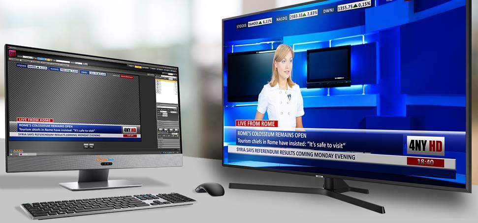 The solution is ideal to display graphical contents, such as text, logos and animations, crawls, tickers and rolls with dynamic contents/metadata retrieved from external data sources, like RSS, txt, Microsoft Excel files and more. Top broadcast quality and easy of use allow CG Live to be used for News Graphic, live production in talk shows, sports and entertainment.