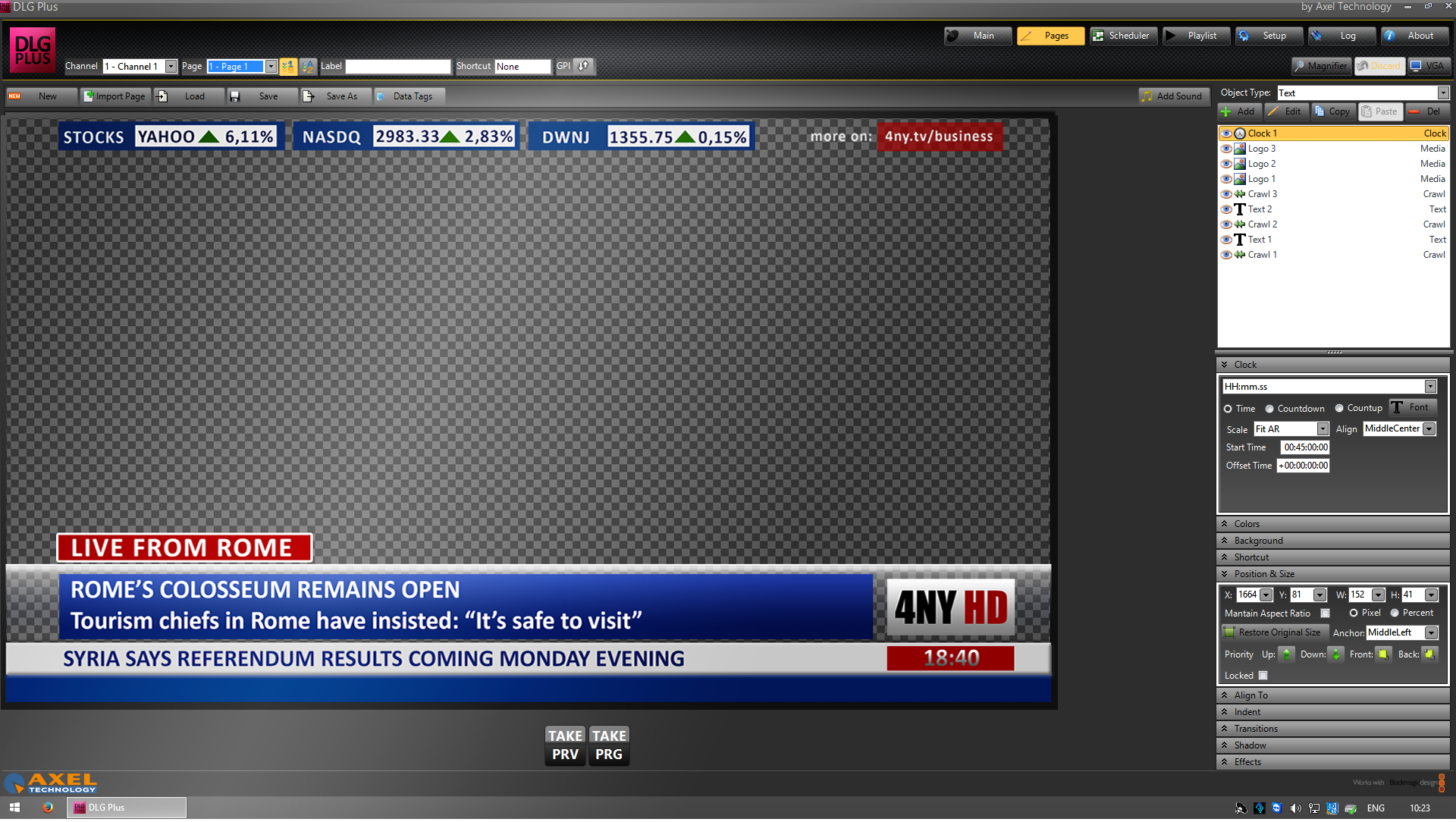 DLG Plus is very simple to use and does not need any specific training. The user interface of the main playout section is displayed as a video mixer-like control with preview/program button bar and preview/ program video windows allowing users with basic video mixer knowledge to immediately get confident with the CG and graphics operability. Page compositing is also very user friendly and allows to add multiple object like texts, clocks, crawls, rolls and media (audio, bitmaps, video and animations) e and define their specific aspect in detail.