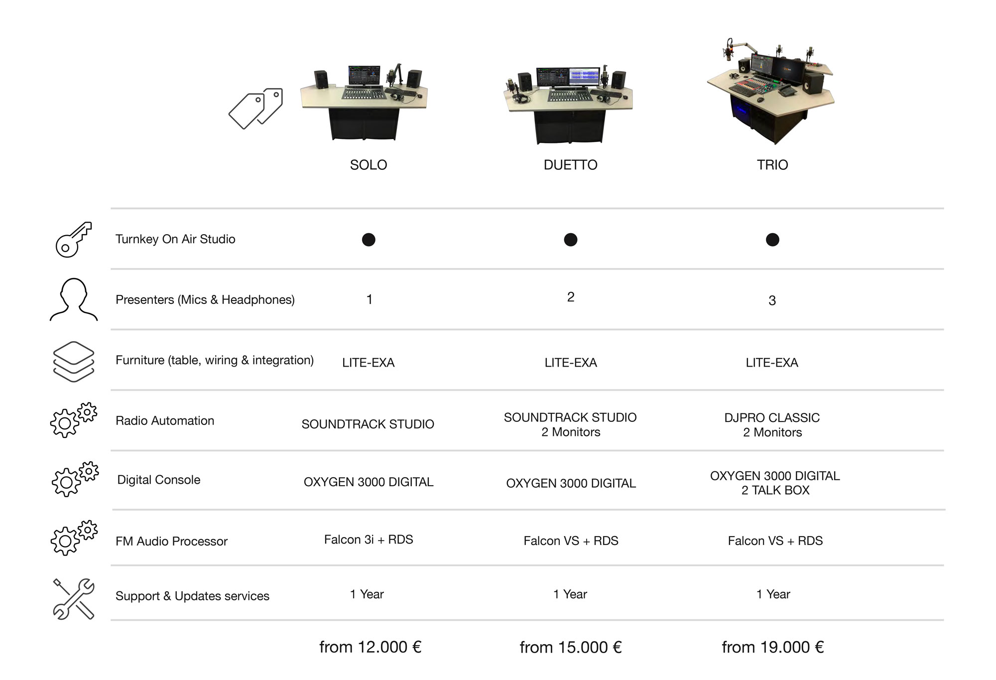 Compare some of our standard setups and contact us to get your own configuration.Setups can be combine to design Radio Station with multiple studios. Each solution can be customize in every single detail and component.
