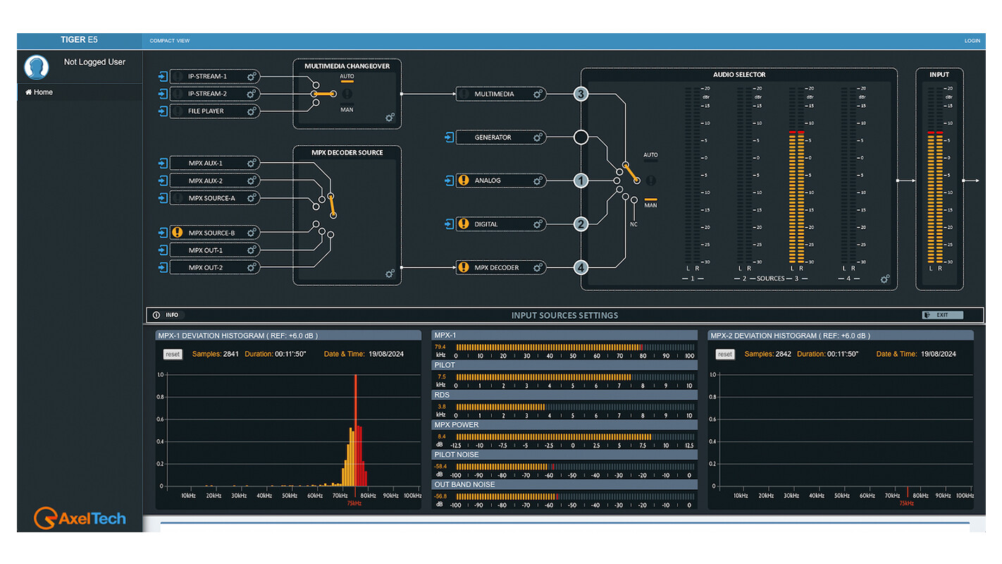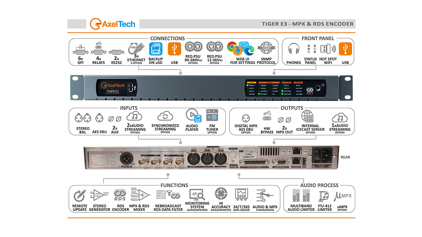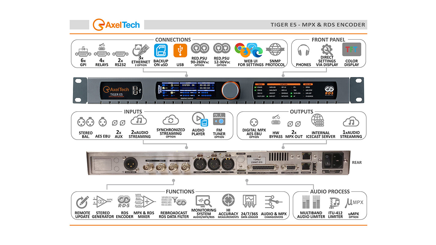 The MicroMPX lovers can now take advantage of all the additional options allowed by AxelTech Tiger E3/E5, like four channel changeover, backup SD card audio player, RDS post-processing, MPX, and RDS decoding for monitoring, and many more, which can satisfy any need at the transmitting site.