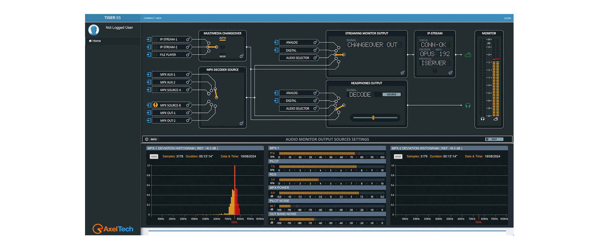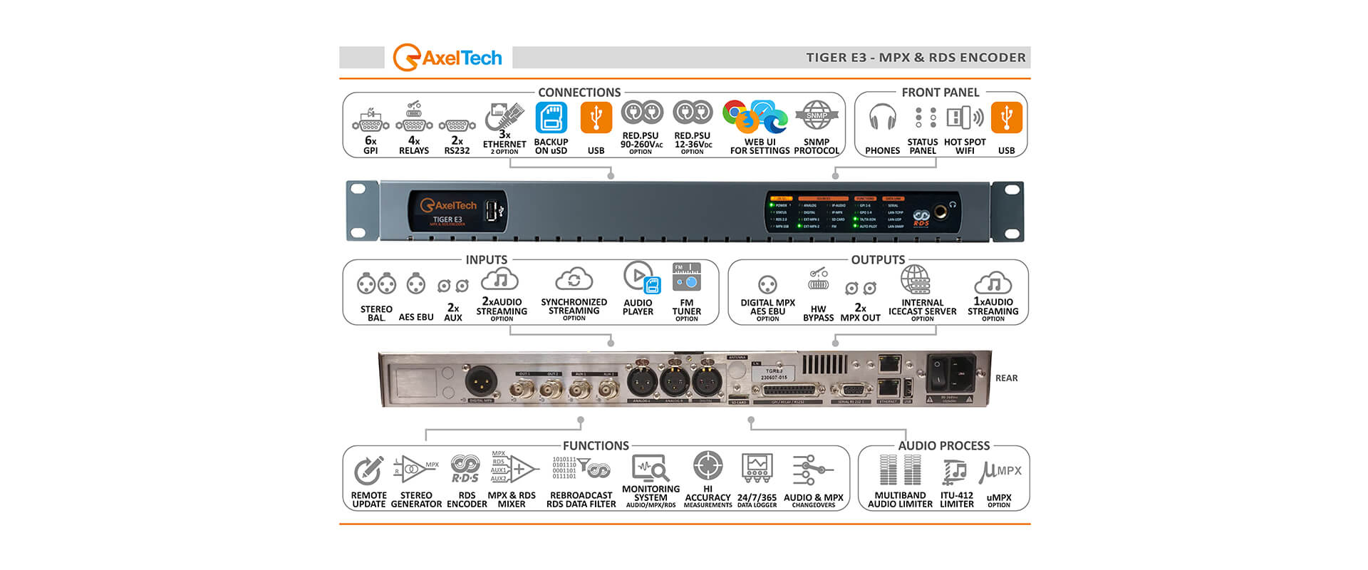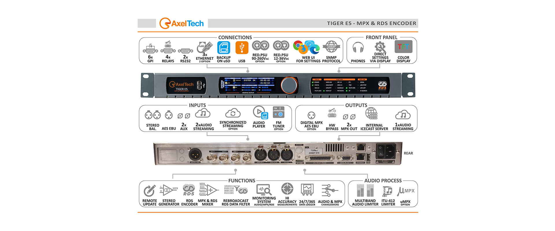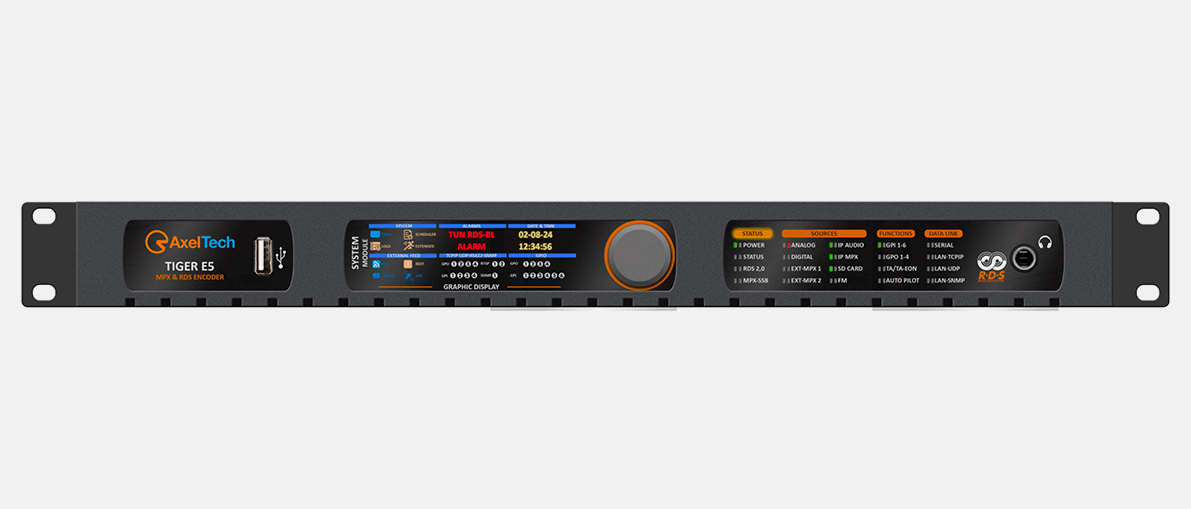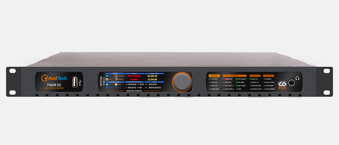 The MicroMPX lovers can now take advantage of all the additional options allowed by AxelTech Tiger E3/E5, like four channel changeover, backup SD card audio player, RDS post-processing, MPX, and RDS decoding for monitoring, and many more, which can satisfy any need at the transmitting site.