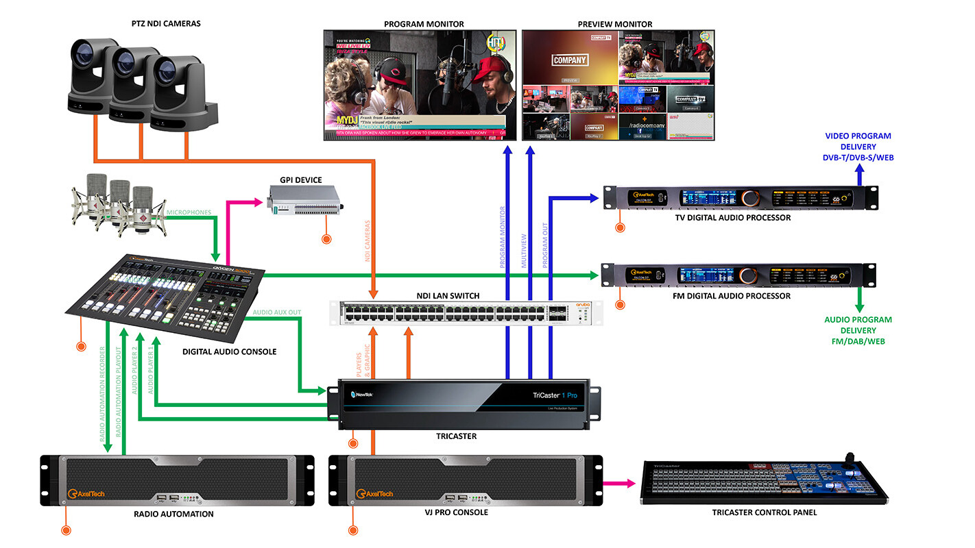 AxelTech provided the Visual Radio subsystem and advisory services for the commissioning. The centralized Visual Radio Control Room was configured to go on air with one of the 6 studios equipped for Visual Radio productions, including cameras, lights, monitors, and more.