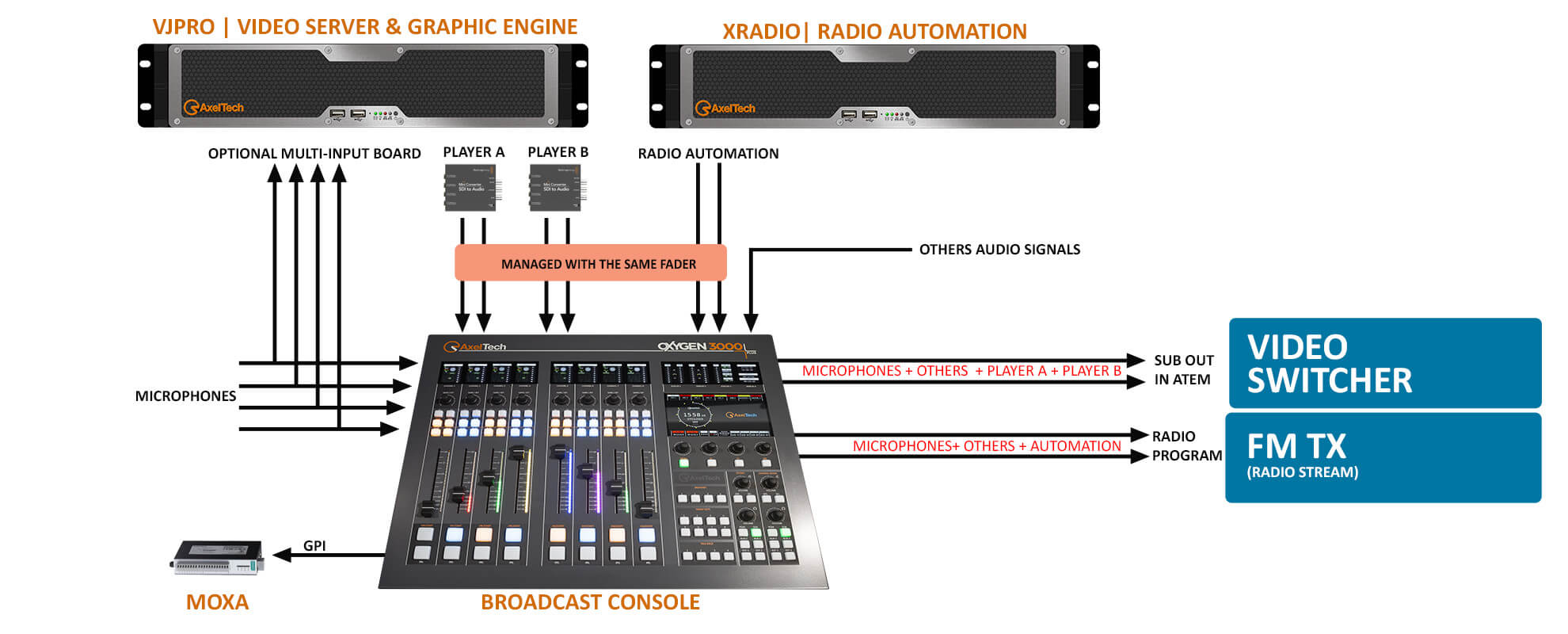 - Radio Console – Native integration with Oxygen digital radio console. Custom modules to integrate third-party mixing consoles (Studer, Axia, Lawo, DHD, Wheatstone, etc.). GPIO management;