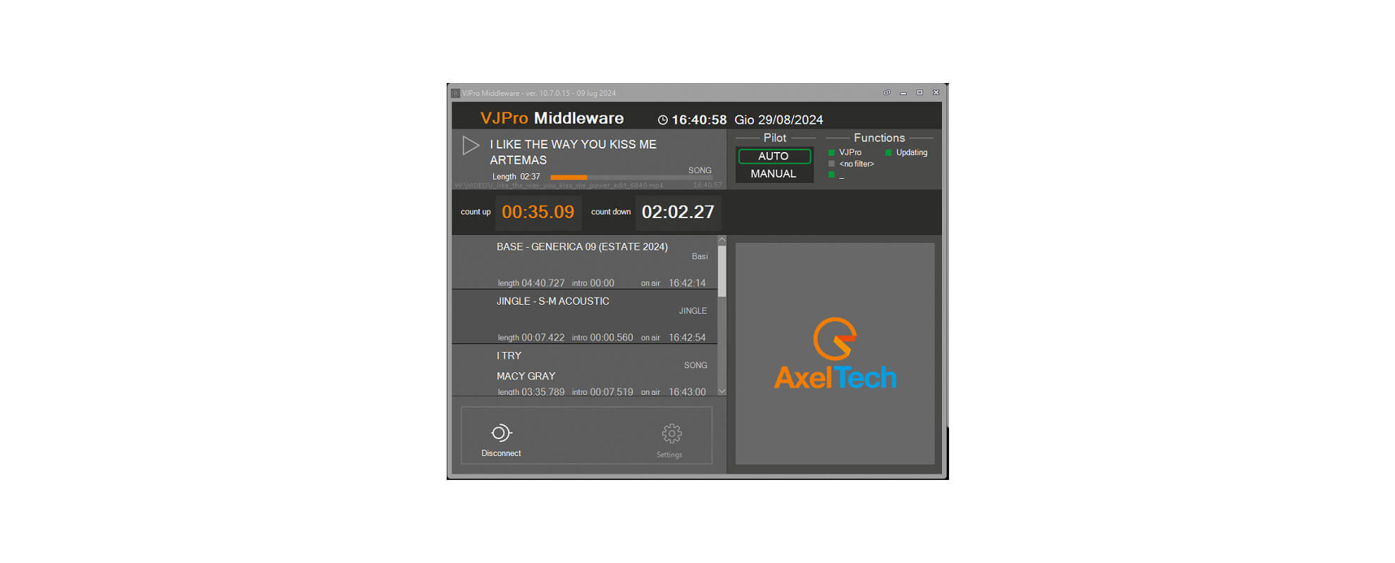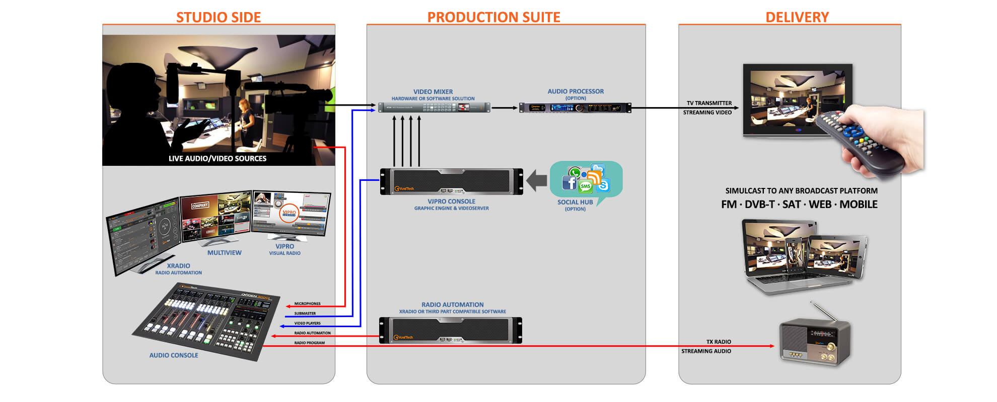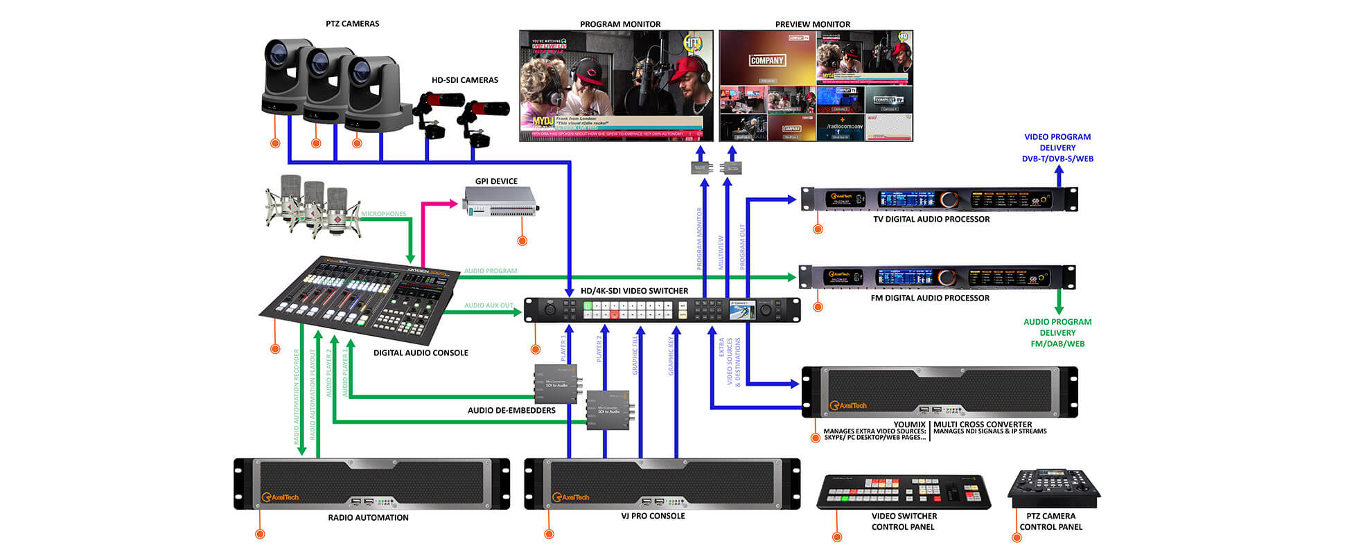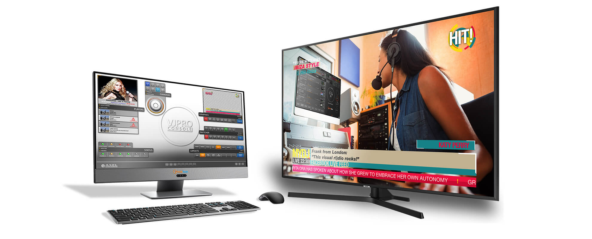 VJ Pro, the Visual Radio solution by AxelTech, has no impact on Studio Workflow, no need for additional technicians, and only quick training for the system setup. Live Radio programming and shows can be broadcast simultaneously on both Radio and TV without incurring the costs and efforts usually associated with traditional TV production. You don’t need TV expertise, the production cost is close to zero, and it involves a one-time minimal investment. Visual Radio runs with the same technical staff and talent used at the radio station. Radio keeps its workflow and equipment since VJ Pro can be connected to any Radio Automation system and Digital Mixing Console.