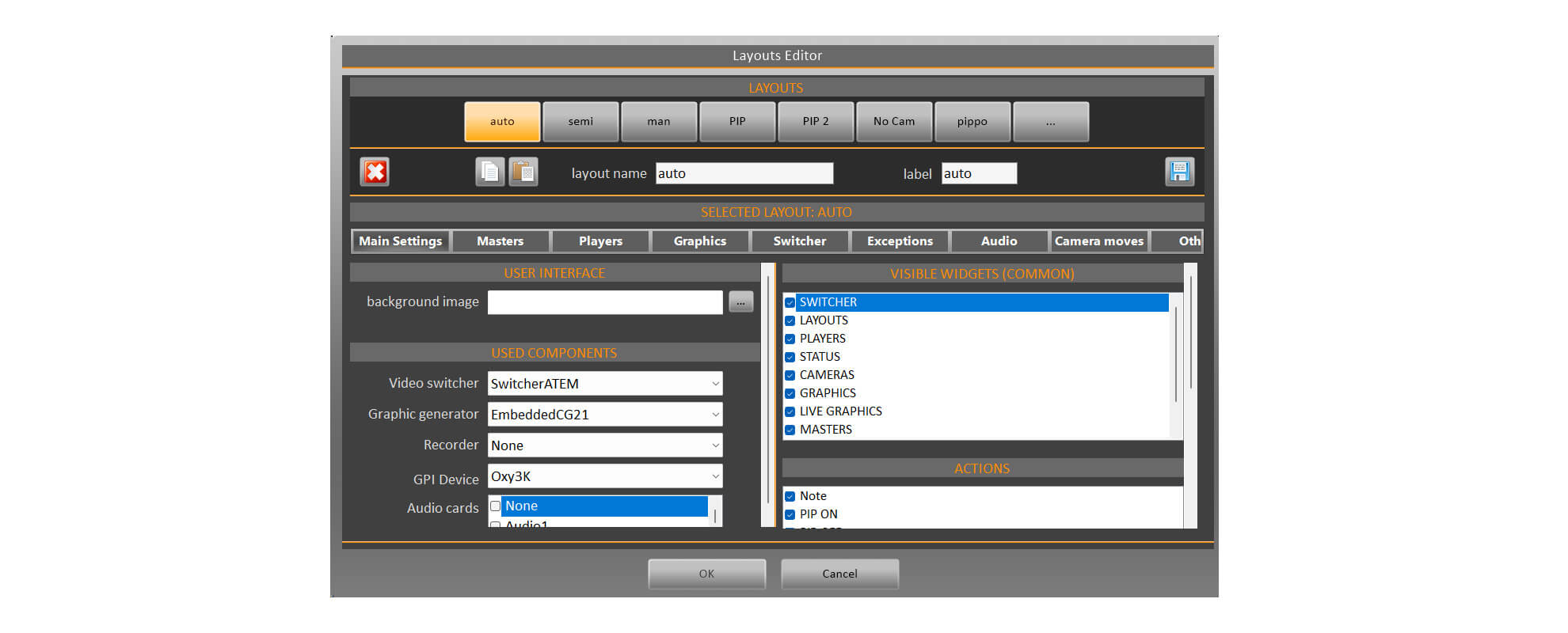 - Cameras – Camera control (Sony/Visca/Panasonic protocols). Intelligent switch for automatic camera switch (multiple configurations and rules).