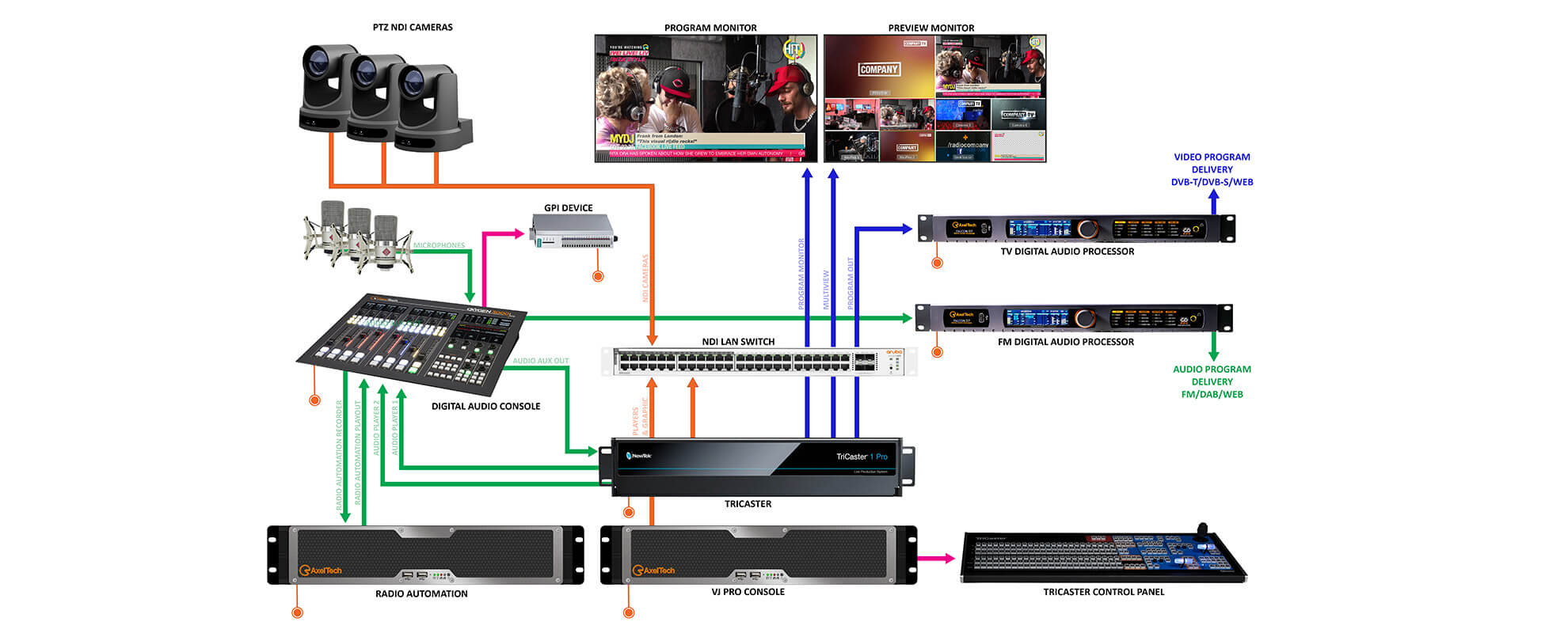 AxelTech provided the Visual Radio subsystem and advisory services for the commissioning. The centralized Visual Radio Control Room was configured to go on air with one of the 6 studios equipped for Visual Radio productions, including cameras, lights, monitors, and more.