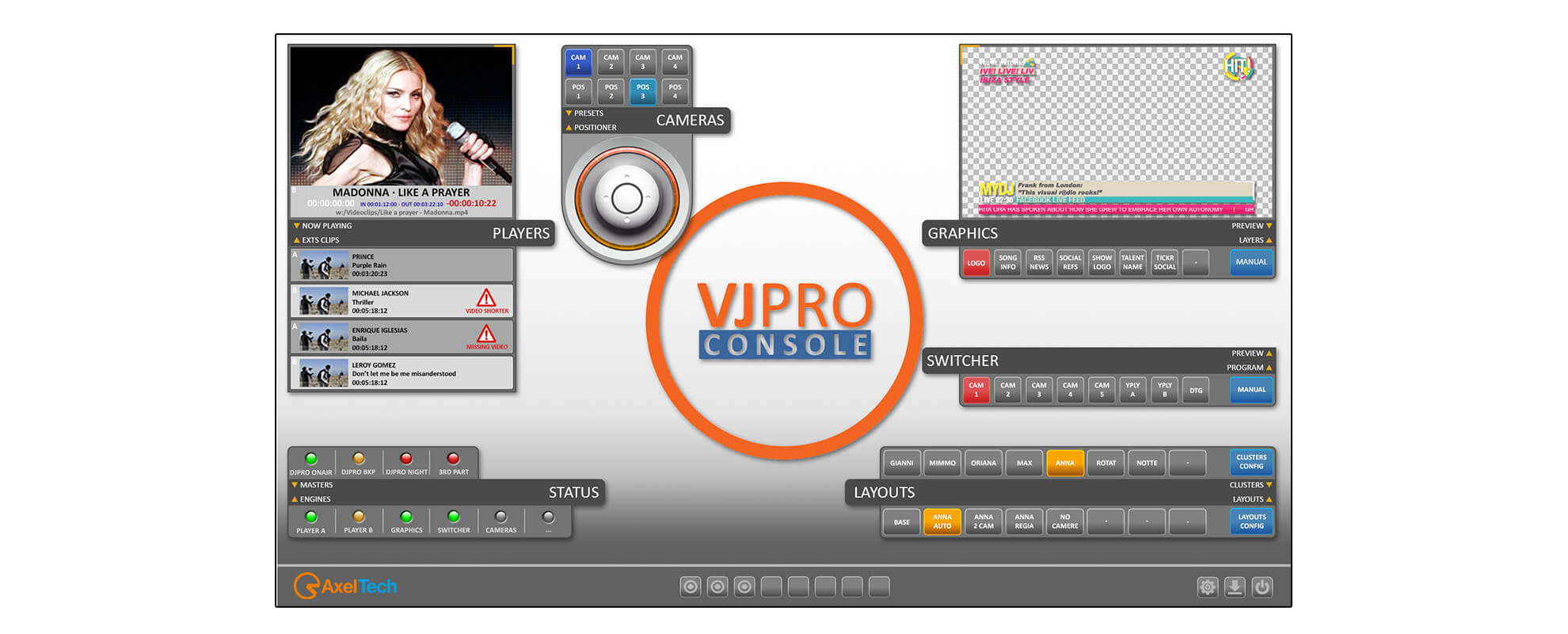 While a song is on the air VJ Pro coordinates to play the video, and switches the cameras when hosts activate the microphones or when journalists air the news. VJ Pro drives an intelligent switching for cameras: it can be manual or automatic according to the many criteria and combinations of status, and cameras can be controlled by the fader status or the microphone levels on the Radio mixer. VJ Pro does it at best with both simplicity and accuracy. Auxiliary sources from the Web or Desktop can be imported, such as video calls from Skype, clips from YouTube, etc. It is also possible to have a social network integration to display content from Facebook, WhatsApp, Twitter, and more. The VJ Pro Console is the engine and the control panel of whatever happens to the VJ Pro System and the connected devices. VJ Pro gets the info from the Radio automation system of any audio played (song, jingle, ads, news, recorder program, etc.), any live programs (talk shows, news, feeds, etc.), and any action on the audio mixer (fader, GPI, etc.) and consequently activates the related video content and graphics. The fully automatic production workflow can always be switched to manual.
