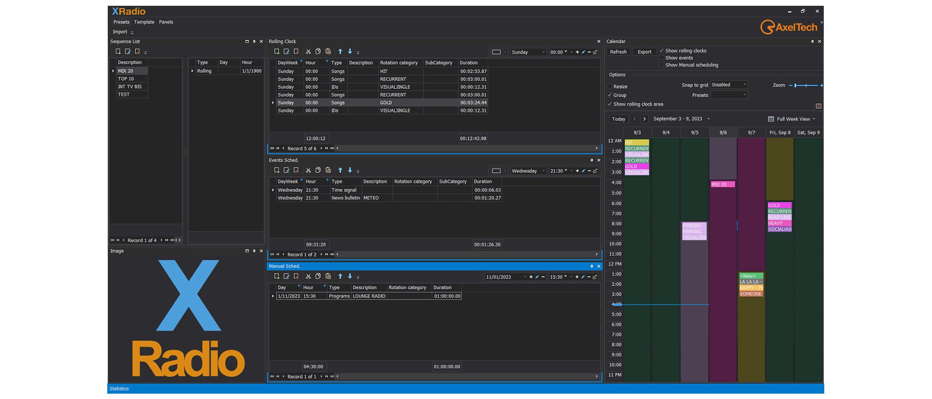 XRadio has a customizable skin: colors, graphics, notes on any item on the schedule and tags in the dedicated clock segments, memos about callers, questions for an interview, selected stories of the day. Everything needed to make a basic schedule a great program, here is where creativity finds its place to be free!