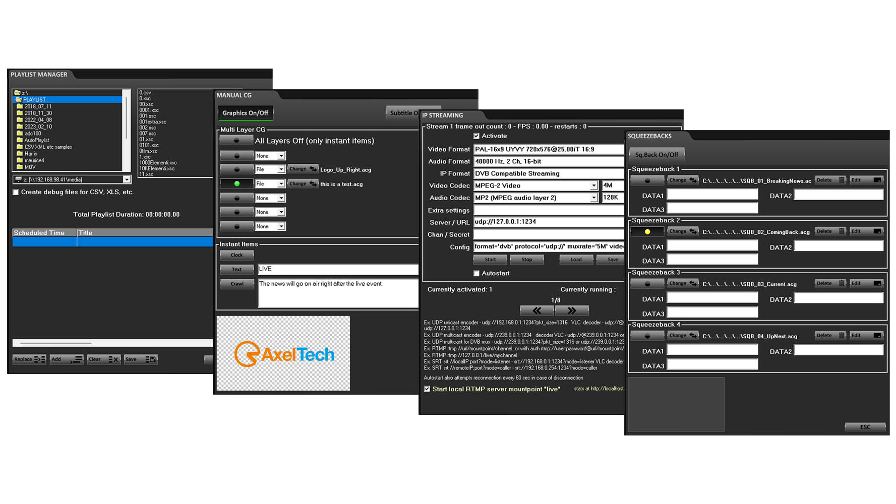 An internal IP encoder allows sending playout output via UDP to external multiplexers, or via RTMP, HLS, RTSP, IIS Live smooth, or windows media streaming to cloud servers for media distribution on internet. If an Nvidia GTX or better board is installed, GPU accelerated compression allows to use H264 and H265 codecs without affecting the computer’s CPU.