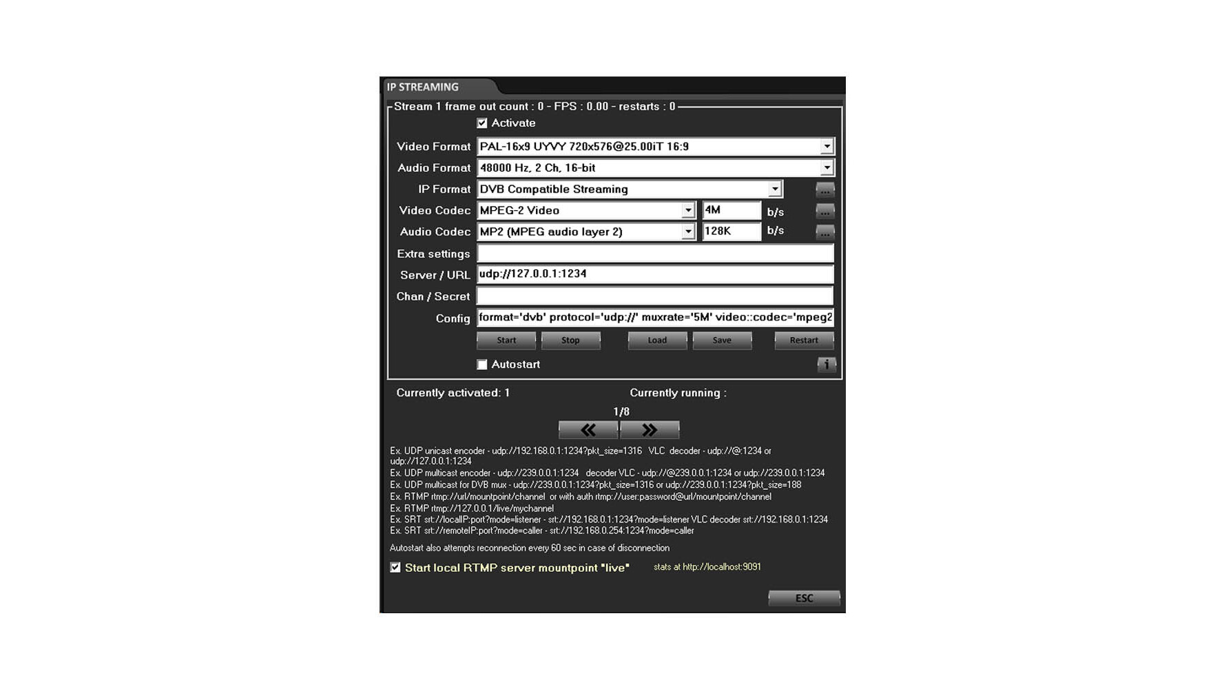 - Direct streaming output transport stream MPEG2 and H.264 codec, or RTMP
