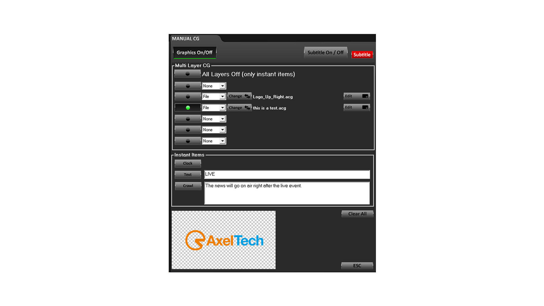 - Advanced CG with clocks, tickers, rolls, crawls, bitmap animations, any video file format