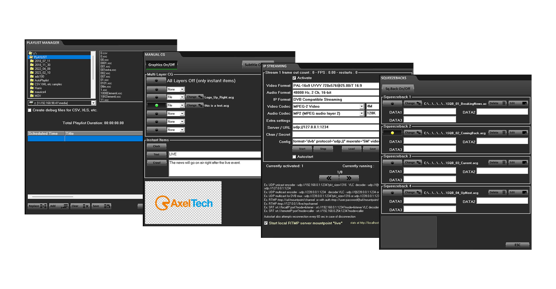 An internal IP encoder allows sending playout output via UDP to external multiplexers, or via RTMP, HLS, RTSP, IIS Live smooth, or windows media streaming to cloud servers for media distribution on internet. If an Nvidia GTX or better board is installed, GPU accelerated compression allows to use H264 and H265 codecs without affecting the computer’s CPU.