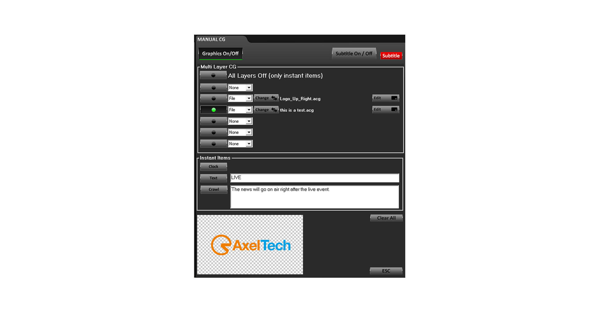 - Advanced CG with clocks, tickers, rolls, crawls, bitmap animations, any video file format