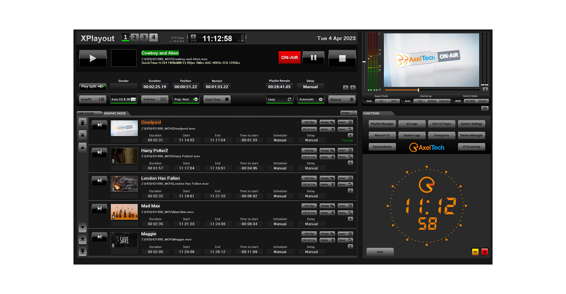 - Complete workflow management tools: scheduling, trimming, graphic composer