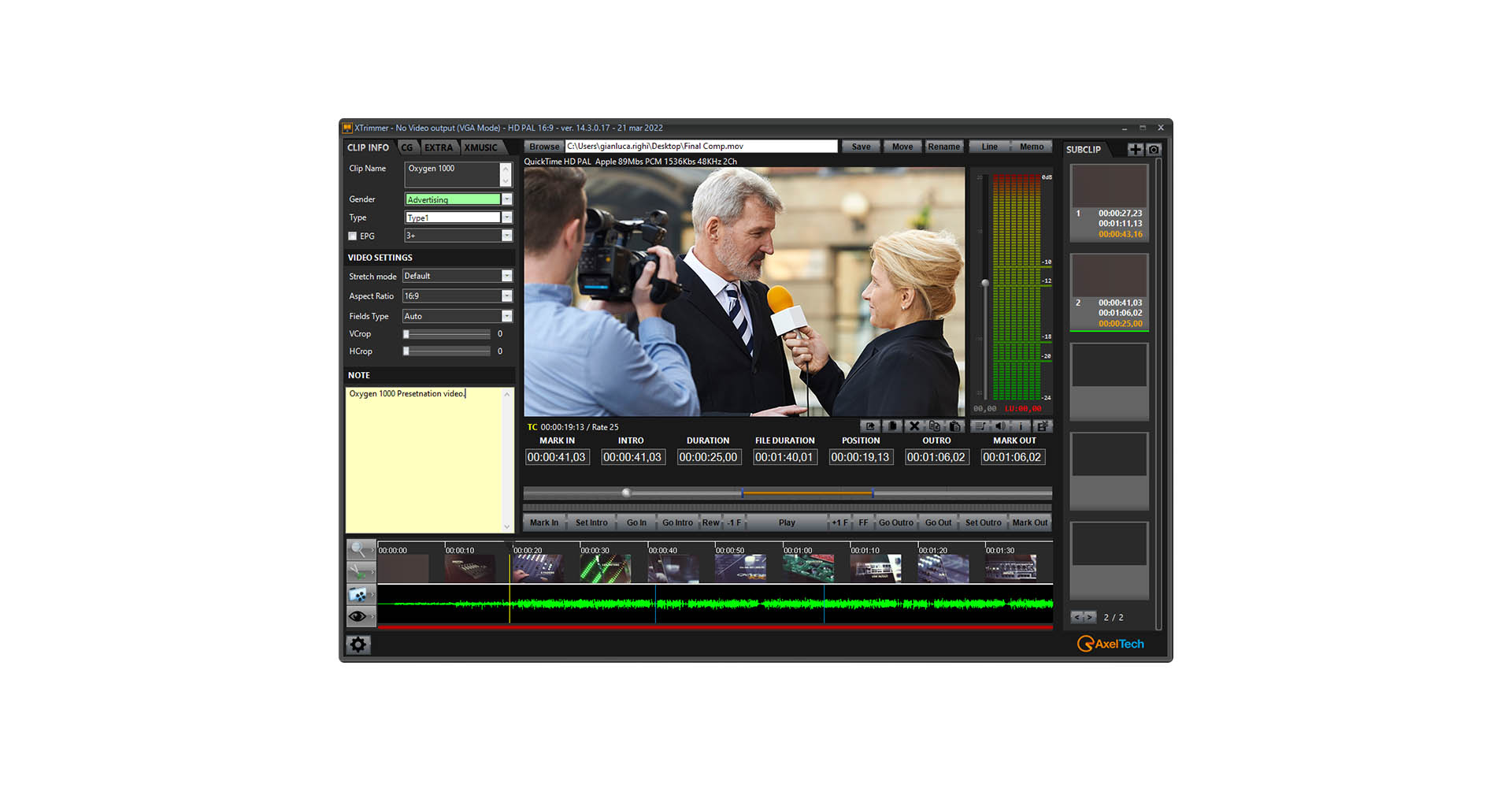 XTV plays out any kind of media in any resolution: DV, HDV, MPEG-2, MPEG-4, MPEG-1, H.264, QuickTime, MXF, XDCAM, PRORES, DNXHD, GXF, LXF, etc. XTV allows to play and mix any media format according to broadcaster’s production workflow and pros and cons of each AV codec.